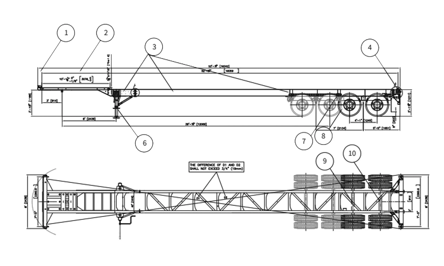 The tandem sliding range allows the distance between the center line of the king pin and the rear axle to be less than 40’ (California / Rhode Island Regulation)